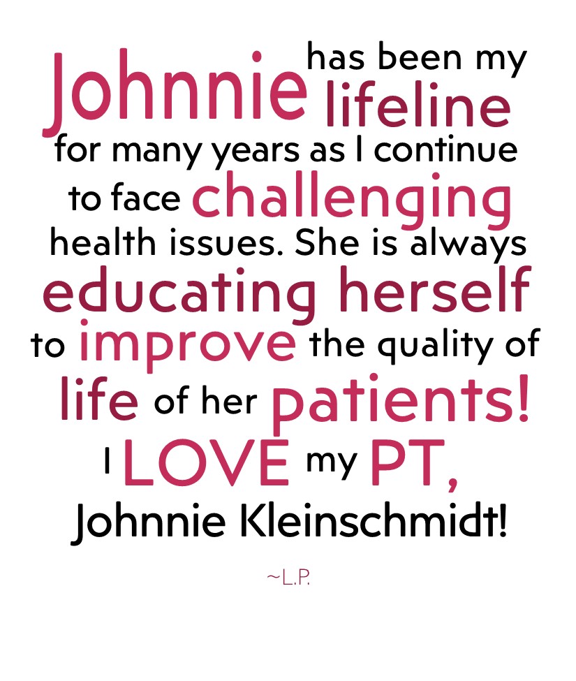 “Johnnie lives and breathes for her patients. She helps women with their most intimate and painful problems and moves mountains if there’s even the possibility that moving that mountain will help her patient. She is a force of healing nature. It is my privilege to work with her on a regular basis as per of a multidisciplinary team to address many women’s hip and pelvis problems. Because of Johnnie, our local mothers and daughters can stay home for treatments instead of traveling out of town or even out of state.”